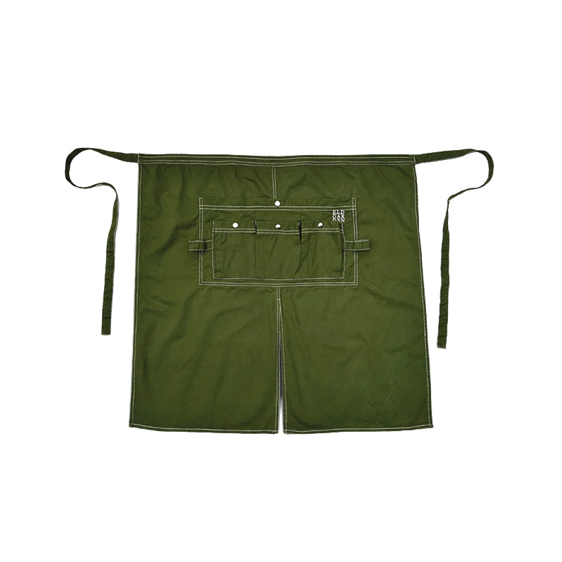 Forklæde i taljeformat i grønt. Forklædet har tre små lommer og en stor lomme med trykknap samt to løkker, der er praktiske til at hænge beskæresaksen op.