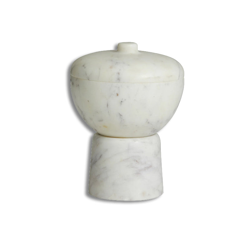 En lille, elegant opbevaringsbeholder med et hvidt marmorlåg.