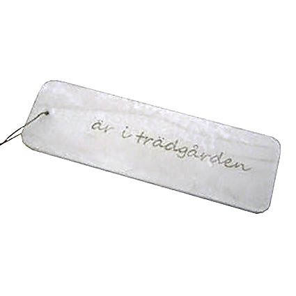 Et hvidt laseret træskilt, som du kan hænge på fx døren, når du er i haven.