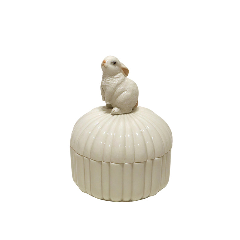 Ask i porslin med en vit sittande kanin på toppen av locket.
