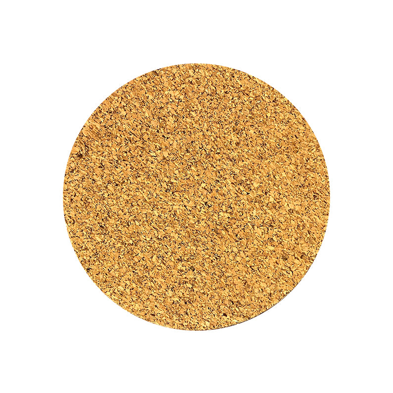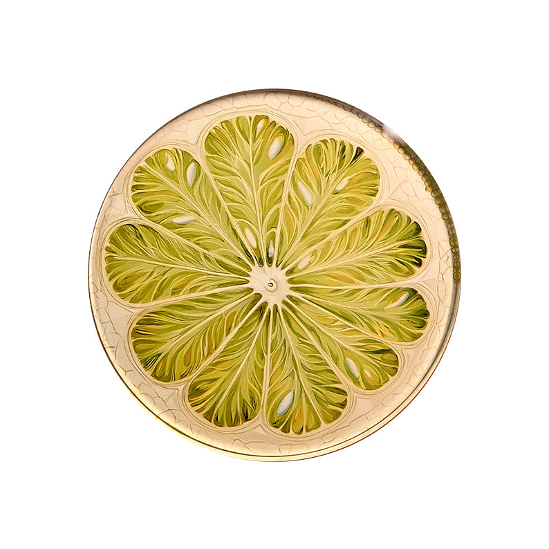 Ett glas underlägg med motiv av en grön limeskiva. Ovansida av glas och en undersida av kork.