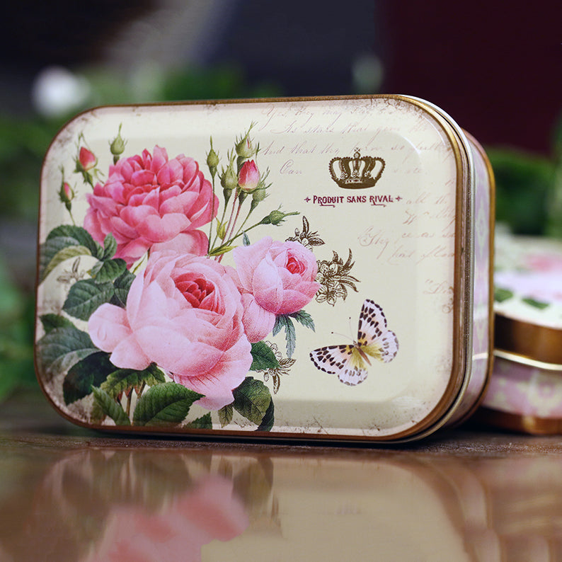 En lite mindre plåtburk som är dekorerad med rosor och ger en känsla av vintage.