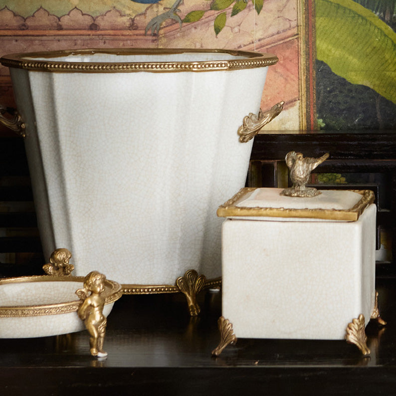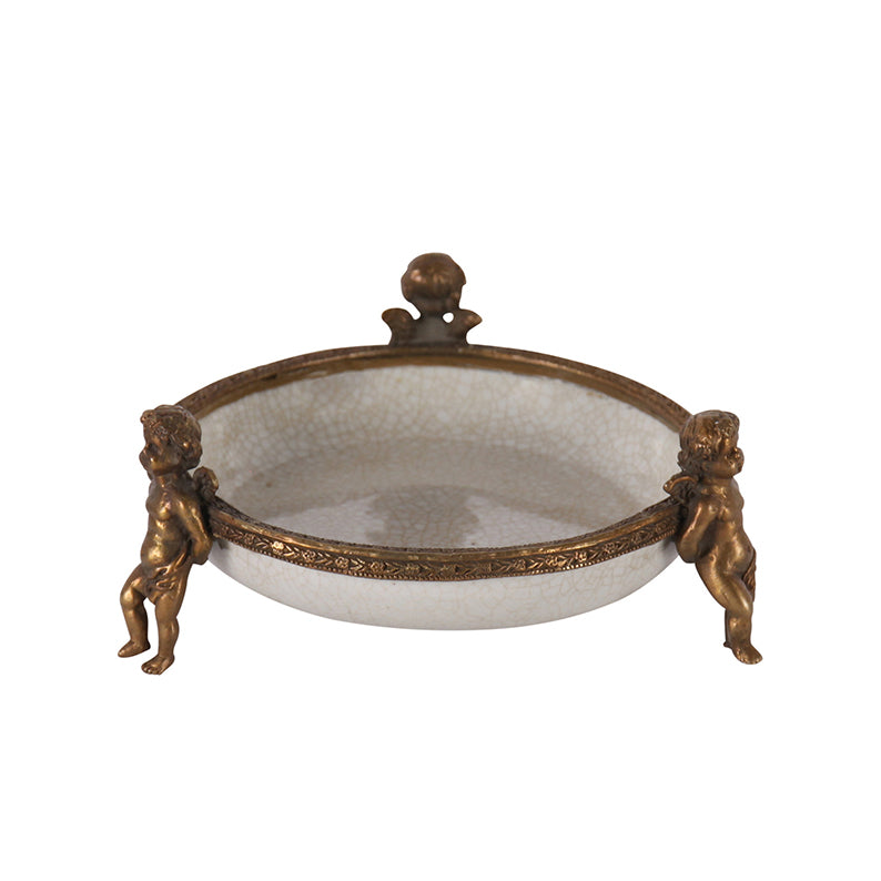 Tre putti som bär upp en skål. Skålens pryds av en förgylld mässingskant. Förvara diverse små saker i den. Porslinet har en krackelerad effekt som är så typiskt för G & C.