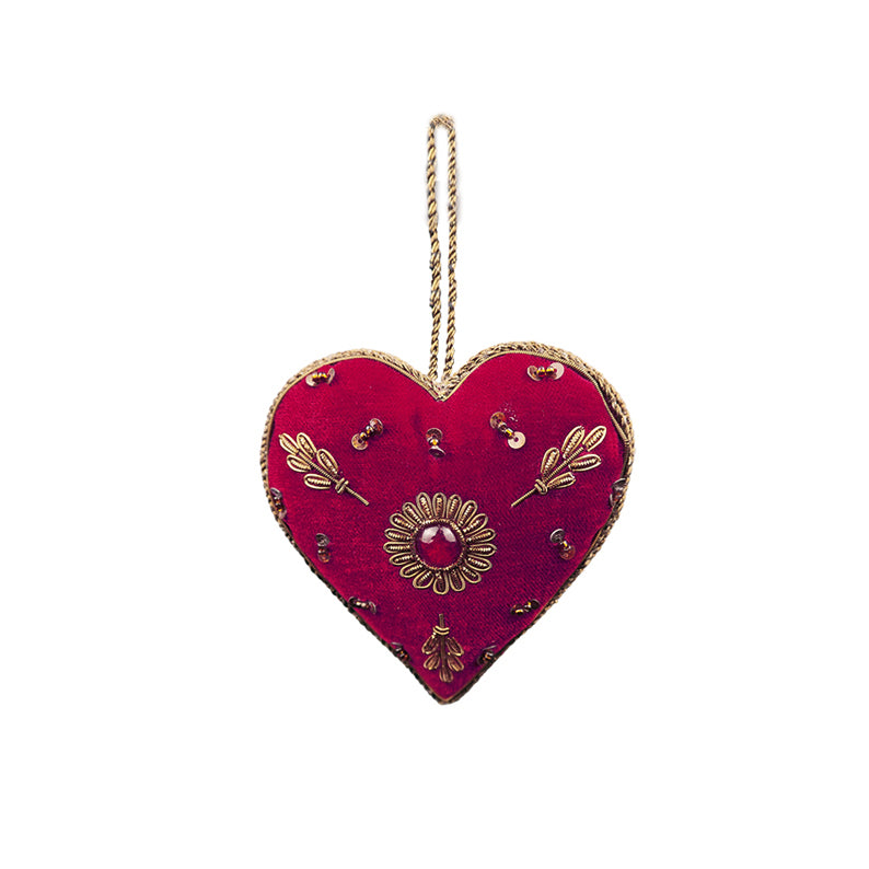 Ett mörkt rött hjärta med handbroderade dekorationer.