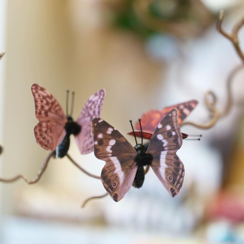 3 olika lila fjärilar med vingar av plast. Tryck på båda sidor av vingarna och en tunn ståltråd löper genom vingen så att det går att böja vingarna på olika sätt. Fjärilarna fästs med en clips klämma.