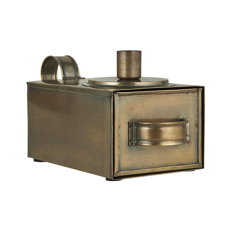 Mässingsfärgad ljusstake. Ljus som passar är de som har en diameter på 21 mm. Ljusstaken har ett handtag som gör det lätt att lyfta den med sig och en låda som det får plats tex tändstickor mm.