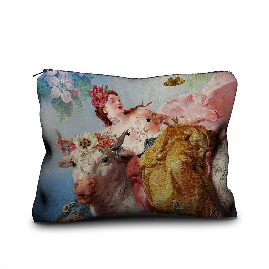 Necessär tryckt på sammet, både fram- och baksida. Guldfärgad dragkedja och ett innerfoder.