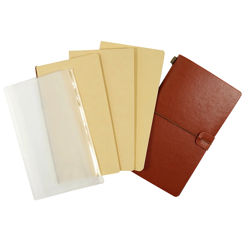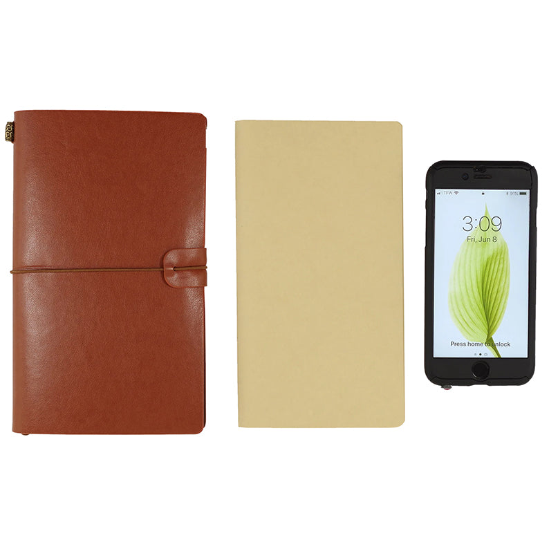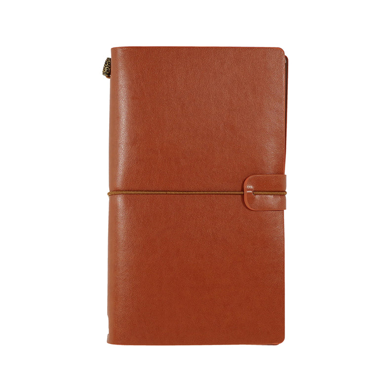 Du stänger din anteckningsboken med ett gummiband. På baksidan av skinnfodralet sitter en brons pärla som dekoration.