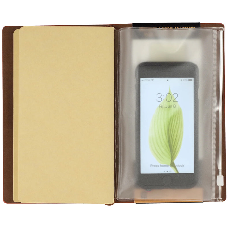 På insidan av främre skinnfodralet, en genomskinlig plastficka.
