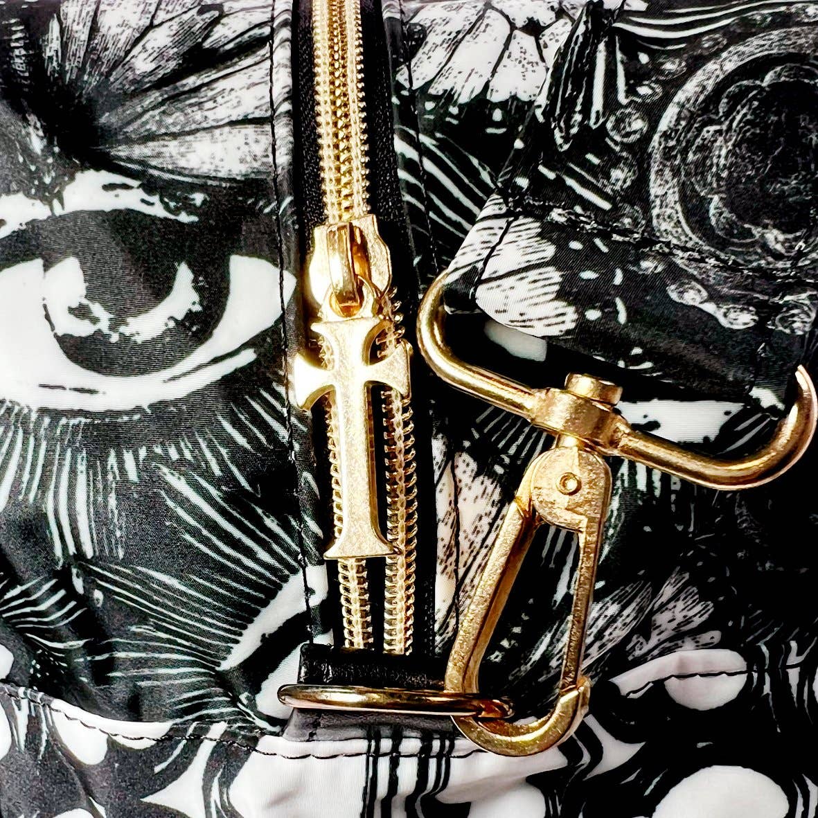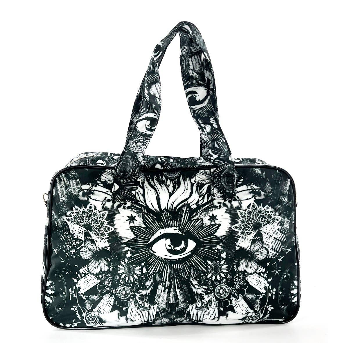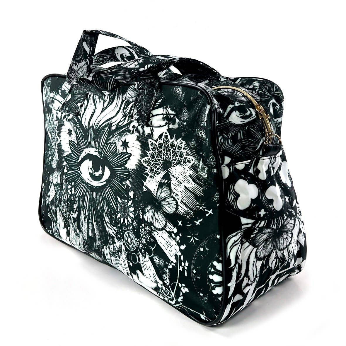 Mönstrad resväska i svart och vitt. Detaljer i gyllene metall. Mitt på väskan syns det "Det Allseende Ögat".