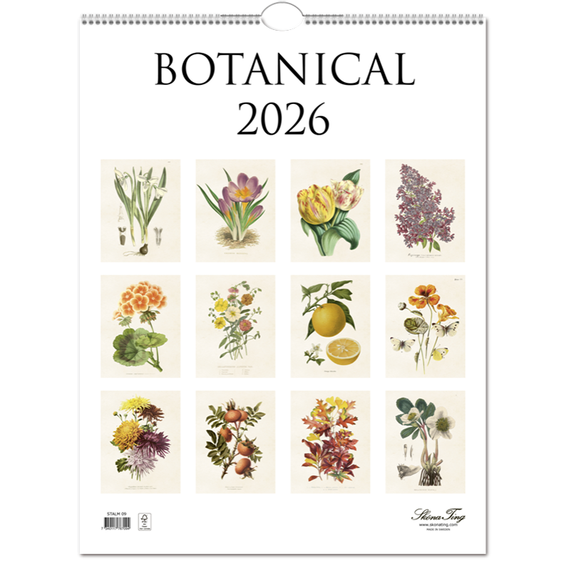En vägghängd almanacka fylld av vackra botaniska illustrationer.